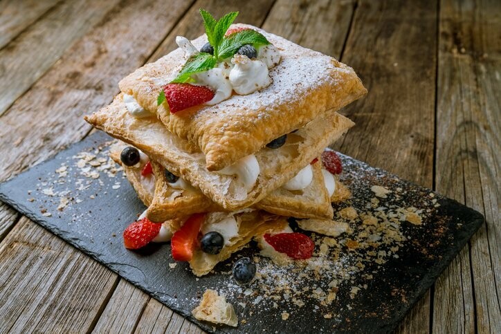 Millefoglie Ai Frutti Di Bosco: 500 g farina sfoglia, 275 g acqua, 10 g sale, 500 g burro, 300 g frutti di bosco, 150 g panna semi montata, 125 g meringa all'italiana, 18 g gelatina, 500 g crema pasticcera, 200 g burro fresco, 100 g cioccolato bianco.